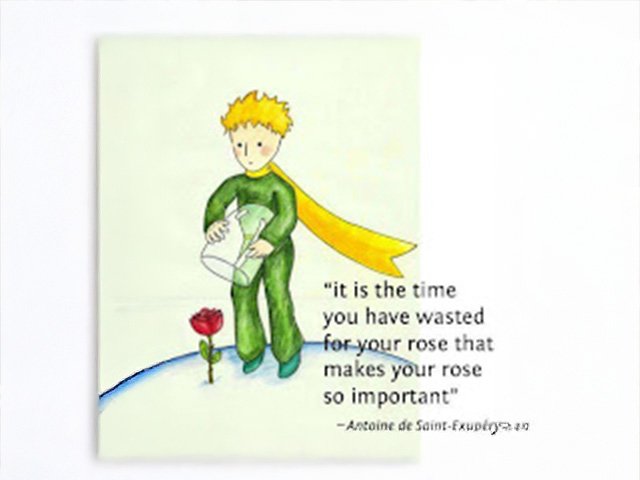 “Lecz dla mnie ona jedna ma większe znaczenie niż wy wszystkie razem, ponieważ ją właśnie podlewałem. Ponieważ ją przykrywałem kloszem. Ponieważ ją właśnie osłaniałem. (...) Ponieważ słuchałem jej skarg, jej wychwalań się, a czasem jej milczenia. Ponieważ… jest moją różą.”