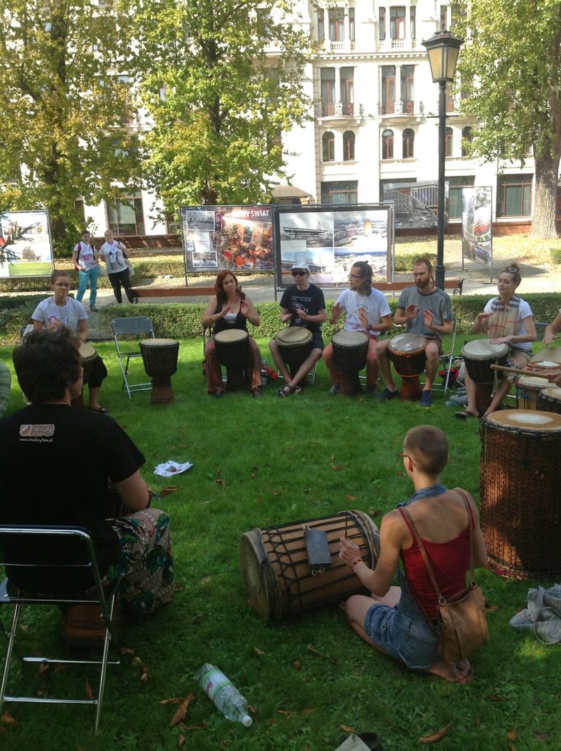 Miałyśmy szczęście bo tego dnia była piękna pogoda, ciepły, ale nie upalny dzień. Spotkałyśmy się w parku z ludźmi profesjonalnie grającymi na bębnach i takimi jak my z koleżanką, czyli amatorami z przypadku. Wszyscy usiedliśmy w kole, każdy dostał bęben i zaczęliśmy grać. Jedna osoba była naszym wprowadzającym, który pokazywał nam jak wybijać poszczególne rytmy.