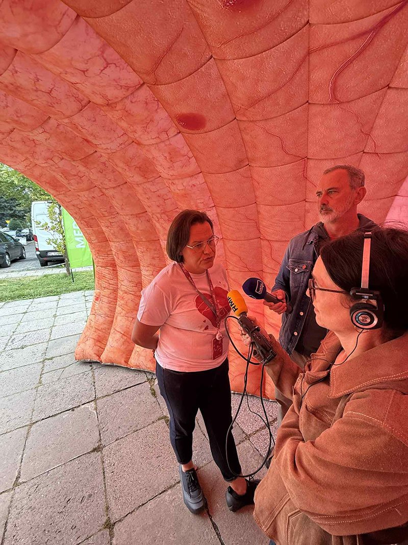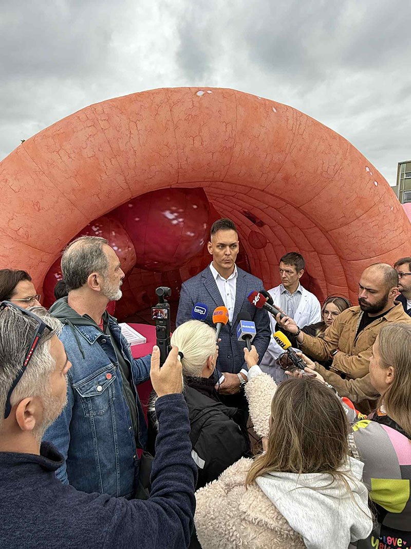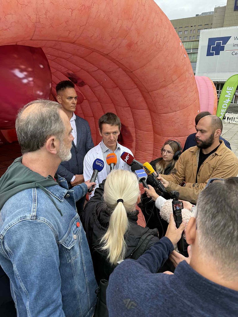 Centralnym elementem wydarzenia była nasza 13-metrowa, interaktywna instalacja – model jelita 3D, która pozwoliła odwiedzającym zobaczyć, jak wygląda jelito w zdrowiu i jakie zmiany mogą w nim zachodzić. Uczestnicy mogli obejrzeć m.in. polipy, uchyłki, stany zapalne oraz nowotwory – schorzenia, które często rozwijają się bezobjawowo, a które można skutecznie wykryć dzięki badaniom profilaktycznym.