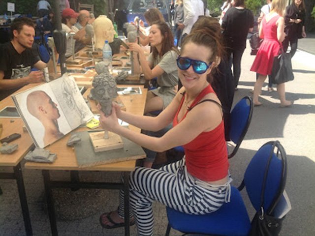 Piękna pogoda zainspirowała mnie do wzięcia udziału w warsztatach z rzeźby. To był strzał w dziesiątkę! Naszym zadaniem było wyrzeźbienie twarzy. Mogliśmy zadecydować czy nasza praca będzie miała charakter realistyczny czy abstrakcyjny. Postanowiłam włożyć w moją pracę cząstkę siebie i swojej historii. Cofnęłam się myślami do czasów kiedy mieszkałam w Nowym Jorku. Miałam wtedy najlepszą szefową jaką można mieć. Wspominam ją bardzo pozytywnie i do dziś utrzymujemy kontakt. Dagy mieszka na Long Island, a pochodzi z Bośni, jednak do USA trafiła po wojnie domowej w swojej ojczyźnie.